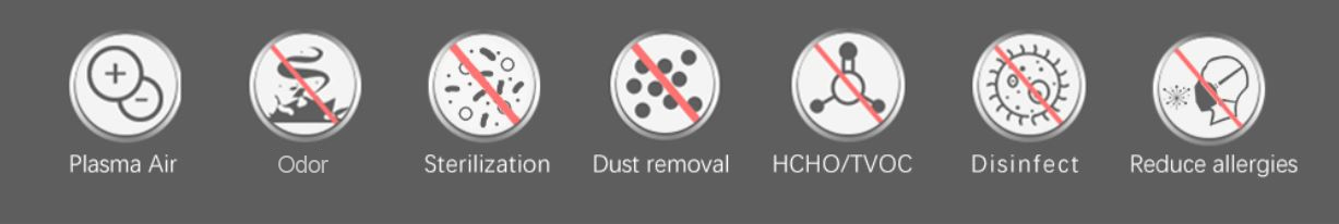 Can effectively eliminate and kill the followings: Plankton mold, planktonic bacteria and viruses, mites, dust, dander, formaldehyde, toluene, xylene, benzene, total volatile organic compounds (TVOC), smoke, sweat odor, assimilated carbon in bus exhaust, carbon dioxide, and Nitrogen oxides, etc., even include influenza viruses, SARS viruses and new coronaviruses.